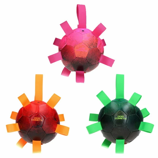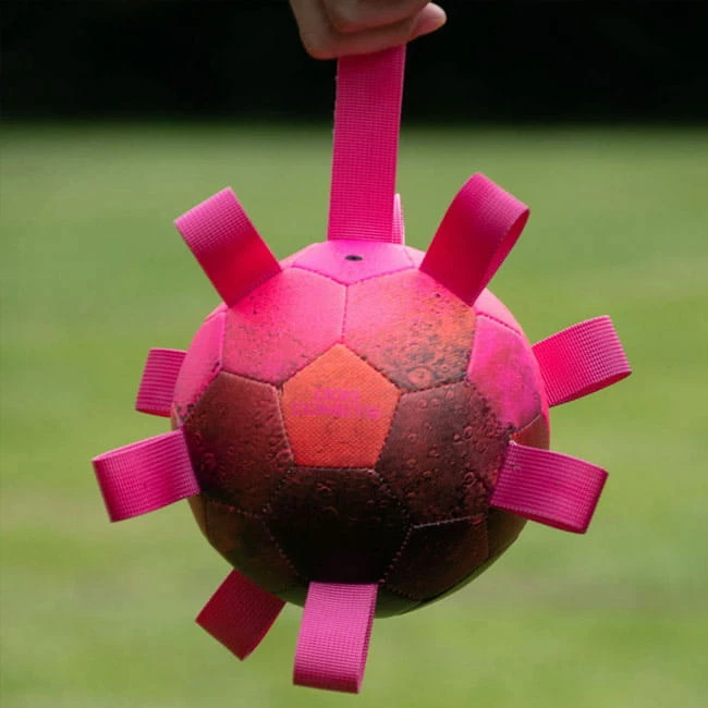 Dieser hochwertige Ball besteht aus drei Schichten und ist daher extrem stark. Der innere Ball ist aus robustem Kautschuk, umgeben von einer Baumwollschicht und die Außenseite ist aus PU-Material gefertigt. Dies macht den Ball weich, langlebig und lässt ihn gut springen. Sicher für die Zähne des Hundes und durch die Schlaufen perfekt zum Aufnehmen und Wegwerfen. Der Ball wird einfach mit der mitgelieferten Pumpe aufgepumpt.