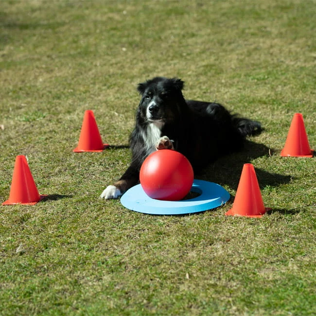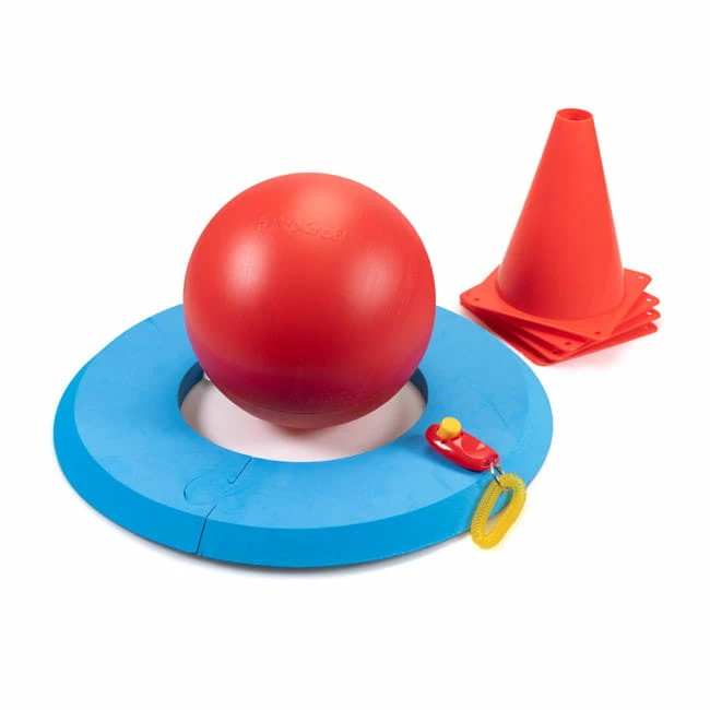 Ziel des Spiels ist es, den Ball in den Target-Ring zu befördern. Dazu wird der Treibball (ca. 20 cm Durchmesser) mit der Nase oder den Pfoten geschubst. Mit den Pylonen (18 cm) lässt sich ein Parcours bauen. Ein Clicker zum positiven Bestätigen liegt auch noch dabei.