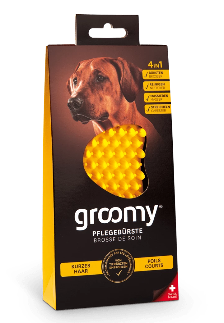 Die einzigartige, superweiche Oberflächenstruktur (ohne Metallteile) birgt im Vergleich zu herkömmlichen Haarstriegel und -bürsten keine Verletzungsgefahr. Das Pflegen mit der Groomy-Bürste fördert die Bindung von Mensch und Tier. Die Silikonnoppen sind für das Tier angenehmer als Finger. Dank raffinierter Entwicklung behalten die Noppen selbst bei festem Drücken, welches die Blutzirkulation der Haut dank Massageeffekt zusätzlich anregt, die gewohnte Form bei. Somit empfinden auch feingliederige Tiere das Bürsten als Wohltat. Die ergonomische Passform liegt sowohl Rechts- als auch Linkshänder bequem in der Hand und passt sich optimal an den Körper des Vierbeiners an.