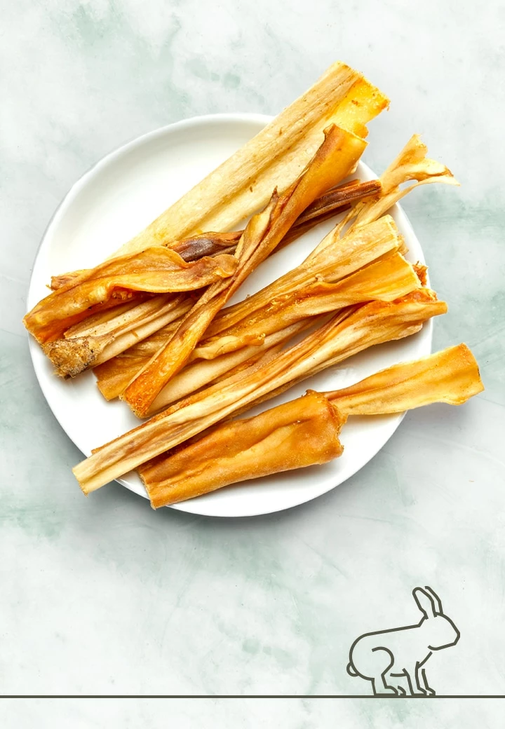 Kaninchenfleisch enthält reichlich Eiweiß mit hoher biologischer Wertigkeit, essenzielle Fettsäuren wie die Linolsäure, gut verfügbares Eisen und lebenswichtige Vitamine, beispielsweise Niacin. Damit bieten Kauartikel vom Kaninchen einen Mehrwert, an dem sich selbst futtermittelsensible Tiere erfreuen können.
