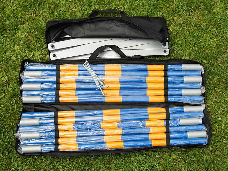 In zwei praktischen Tragetaschen liefern wir die stabile Metallbasis und 12 einschraubbare Slalomstangen. Die Basis ist so ausgelegt, dass der Slalom ganz normal und FCI-Konform gerade aufgestellt werden kann. Dank der „Gelenke“ lässt sich aber auch eine Gasse bilden. Das ist für den Aufbau des Slaloms für den Hund eine tolle Hilfe. Nach Benutzung können die Stangen einfach abgeschraubt und die Metallbasis wieder zusammengeschoben werden. So passt der Slalom problemlos in den Kofferraum.
