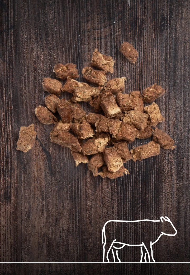 Schmackhaftes frisches Rindfleisch wurde hier zu kleinen Röllchen gefriergetrocknet. Wichtige Eiweiße, Eisen, Zink und B-Vitamine können so beim Training als Belohnung dienen. Das macht Vier- und Zweibeinern Freude.