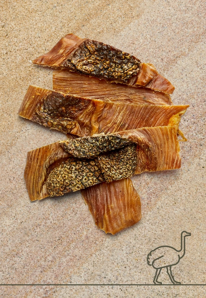 Knackig getrocknetes Magenfleisch vom Strauß. Unterschiedlich lange Streifen bis ca. 20 cm Länge. Gut zu portionieren und für kleine als auch für große Hunde als schmackhafter Snack für zwischendurch bestens geeignet.